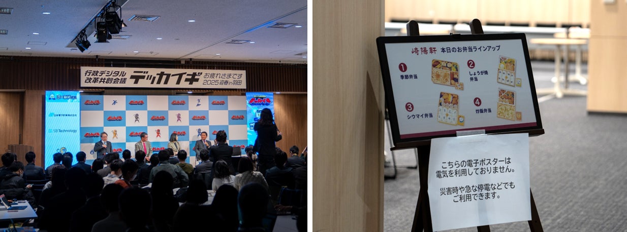 今年1月に開催された「行政デジタル改革共創会議 in 羽田〜お疲れさまです2025迎春〜(略称:羽田デッカイギおつ)」で、弊社の電子ペーパーが「メニュー案内」用途としてテスト導入されました。電子ペーパーは通常のデジタルサイネージと異なり画面表示を維持する為の電力が必要無いことから、災害時の避難所等でのメッセージ表示システムとして注目されています。現に昨年の能登半島震災の避難所でも使用されました。