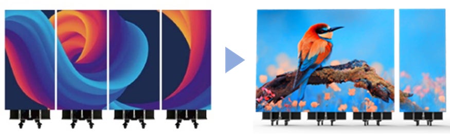 2件の事例でご紹介したように、利用する当日にフライトボックス(収納箱)のまま持ち込み、折りたたまれたLEDパネルを中から引き上げれば1台約5分でセットアップ完了です。さらに各モニターを横に連結することで境目のない大型LEDビジョンとして使えます(EP225タイプを4枚連結で、アスペクト比16:9の181インチ大画面になります)。