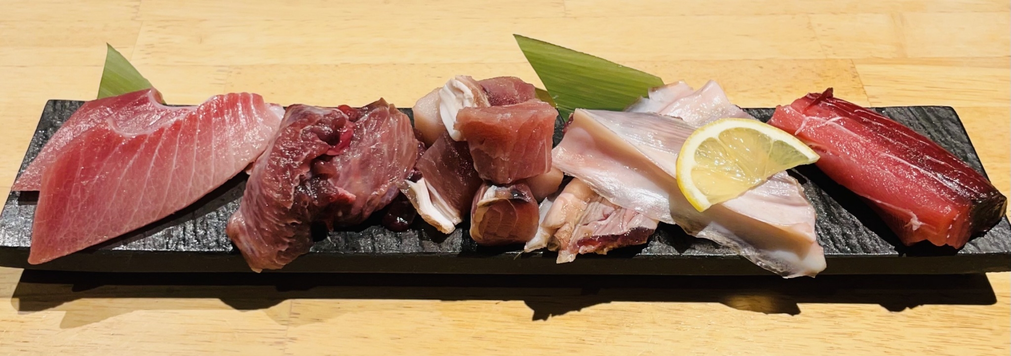 提供されるのは、ジューシーな脂が焼肉ならぬ”焼きうお”にぴったりなマグロのハラモ(ハラモは大トロの横にある魚体の中でも一番脂がのっている部位。焼肉に例えるとカルビのようなジューシーさと旨味が味わえる。)やほほ肉、本マグロの血合いなど。遠赤外線の焼き台でふわっと香ばしく焼き上げると、噛みしめると魚の旨味が口中に広がる。