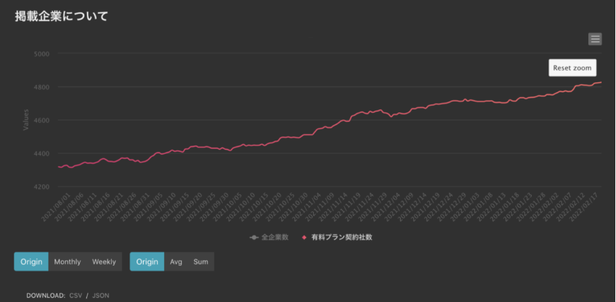 同社はオンラインでダイレクトリクルーティングができる人材SNSを運営しています。月額課金で求人広告を掲載できるプランを提供して得るストック収入と、スカウト等ができるオプションによるフロー収入が主な収益源であり、ストック比率は8割程度です。有料プラン契約企業数と1企業あたりの契約単価の積で同社の売上高は推定できますが、契約単価については利用者へのヒアリングや同社への資料請求等で知ることができます。また、有料プラン契約企業数についてはPERAGARUで提供している下記オルタナティブデータを活用すれば推定が可能です。このように求めた契約単価と契約数の積が同社トップラインの推定値になり得ます。