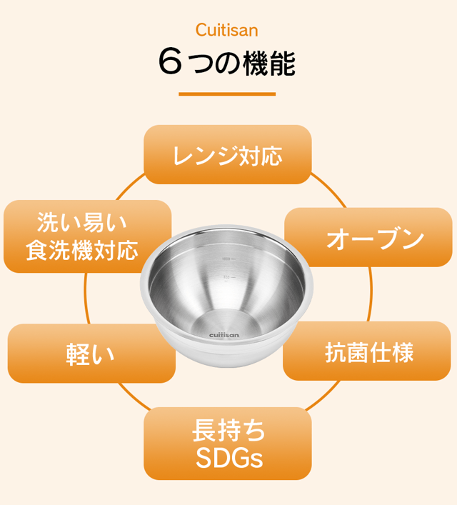 ステンレス製のボウルは、軽くて使い勝手が良く耐久性も高い素材であるが、電子レンジやオーブンで使えないといった調理工程における課題があった。この課題を解決したのがクイッティサンである。