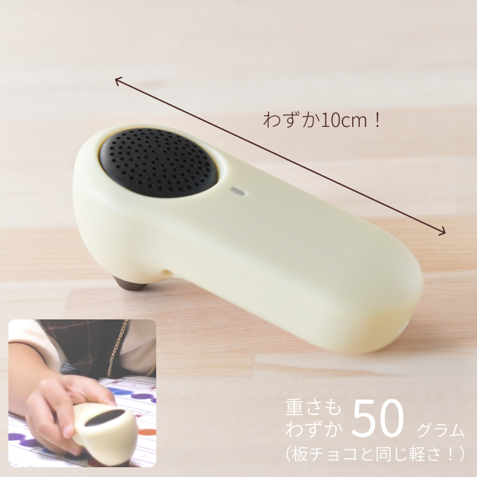 音楽で遊びたい。そんな時に手を伸ばせばラタトーンがある。いつでも音楽と触れ合える状態を提供するべくサイズ感にもこだわりました。全長わずか10cm、重さも約50gほどで小さな手にもフィットするコンパクトサイズ。リビング、ダイニング、寝室、お友達の家など、好きな時にいつでも音楽をお楽しみいただけます。