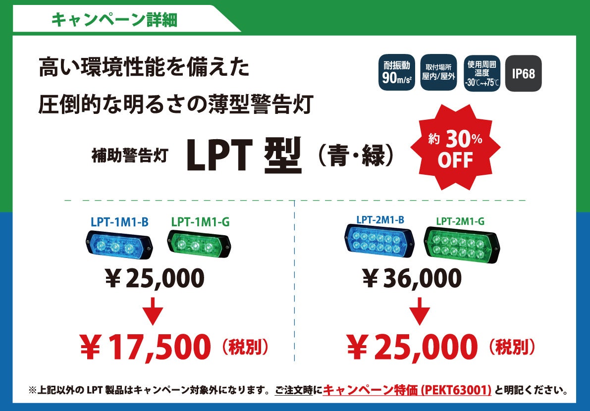 フォークリフト事故など物流倉庫での安全対策が課題となっている中、より気づきやすい圧倒的な報知力が求められています。補助警告灯LPT型は、車載を目的とした仕様であることから、圧倒的な明るさ・認知しやすい発光パターン・高い環境性能を有しており、安全対策としても非常に高い評価を得ています。今回は、LPT型の良さをお試しいただくために、青色と緑色の2色、2サイズをキャンペーン特価で提供いたします。