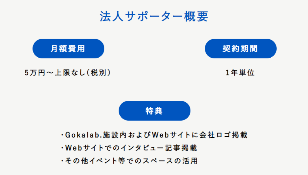 Gokalab.では、施設のコンセプトやビジョンに共感し、施設の運営の持続可能性をともに探究してくださる法人サポーターを募集しております。すでに2社が賛同し参加してくださっており、2023年4月から一般募集を開始いたします。