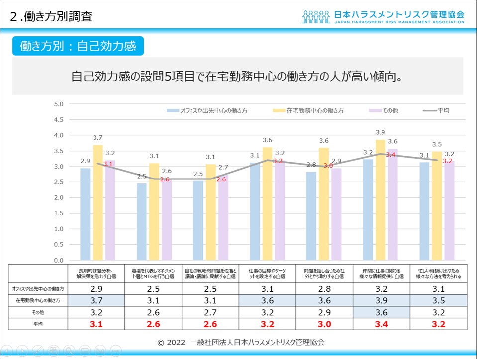 ・自己効力感は「オフィスや出先中心の働き方」と「在宅勤務中心の働き方」における差が最も大きい項目であった。