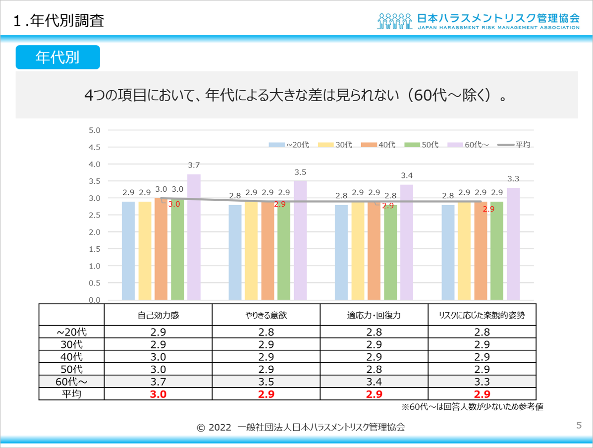 ・「自己効力感」「やりきる意欲」「適応力・回復力」「リスクに応じた楽観的姿勢」の4項目においては大きな差は見られなかった。