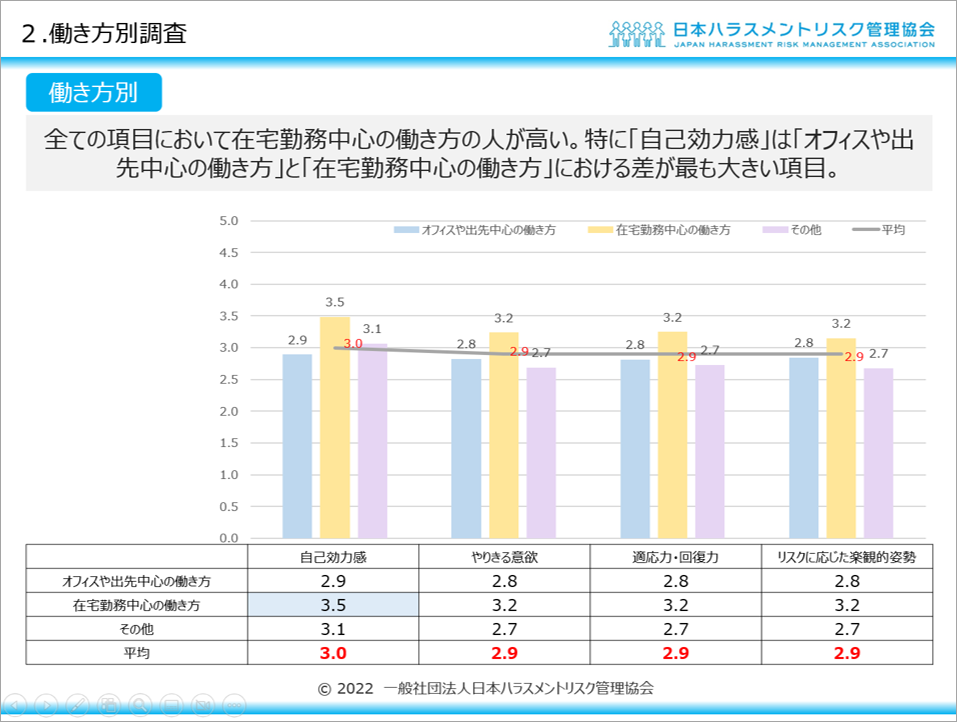 「自己効力感」「やりきる意欲」「適応力・回復力」「リスクに応じた楽観的姿勢」の4項目、計24問の設問で分析した結果、年代別においては大きな差が見られませんでしたが、働き方別においては大きな差があり、在宅勤務中心の働き方をしている人は各項目で高い(ポジティブな)傾向がみられました。