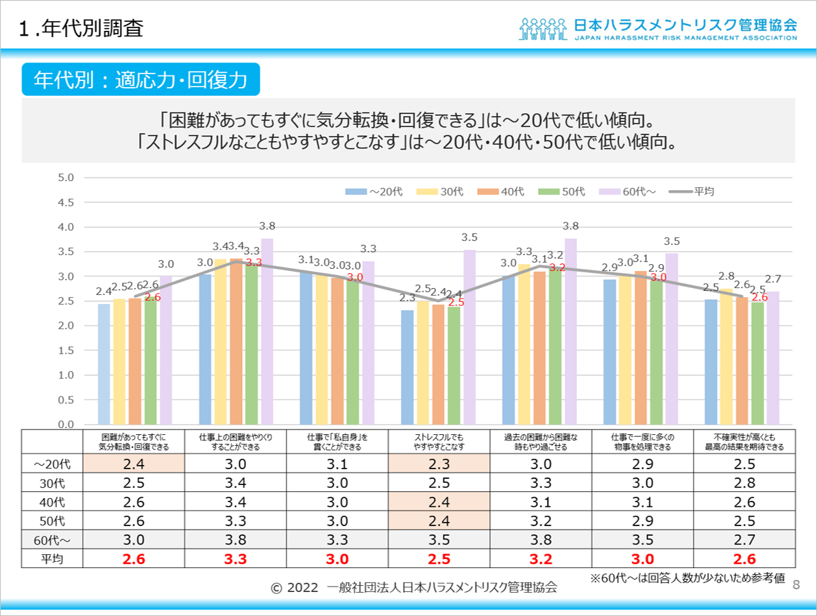 ・適応力・回復力では~20代で「困難があってもすぐに気分転換・回復できる」、~20代・40代・50代で「ストレスフルなこともやすやすとこなす」が低い傾向であった。