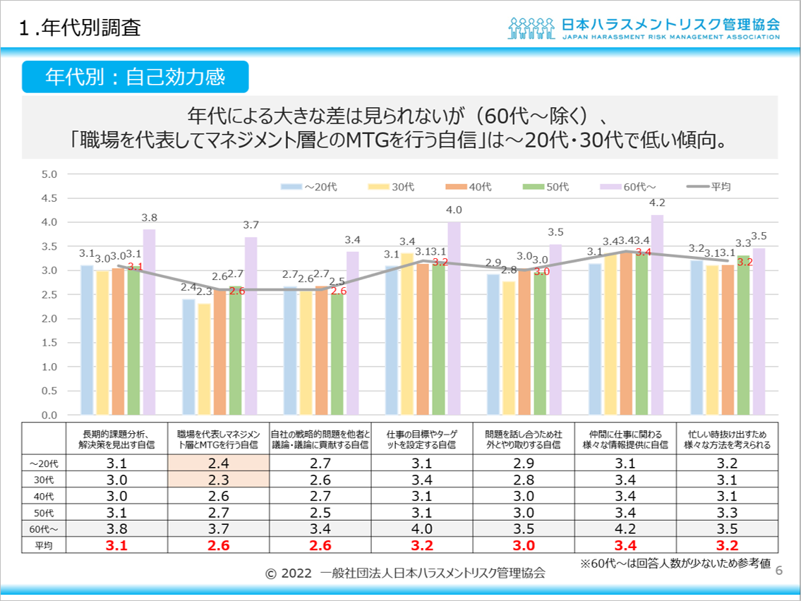 ・自己効力感では~20代・30代の若い世代で「職場を代表してマネジメント層とのミーティングを行う自信」が低い傾向であった。