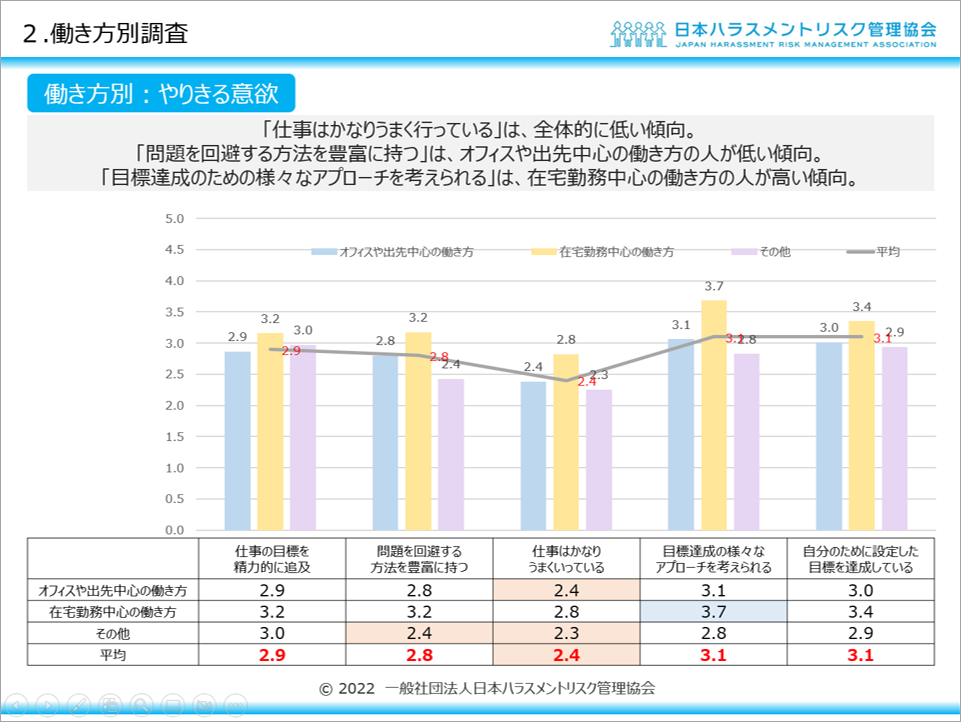 ・やりきる意欲では「仕事はかなりうまく行っている」が全体的に低い傾向。「問題を回避する方法を豊富に持つ」がオフィスや出先中心の働き方の人が低い傾向。「目標達成のための様々なアプローチを考えられる」が在宅勤務中心の働き方の人が高い傾向であった。