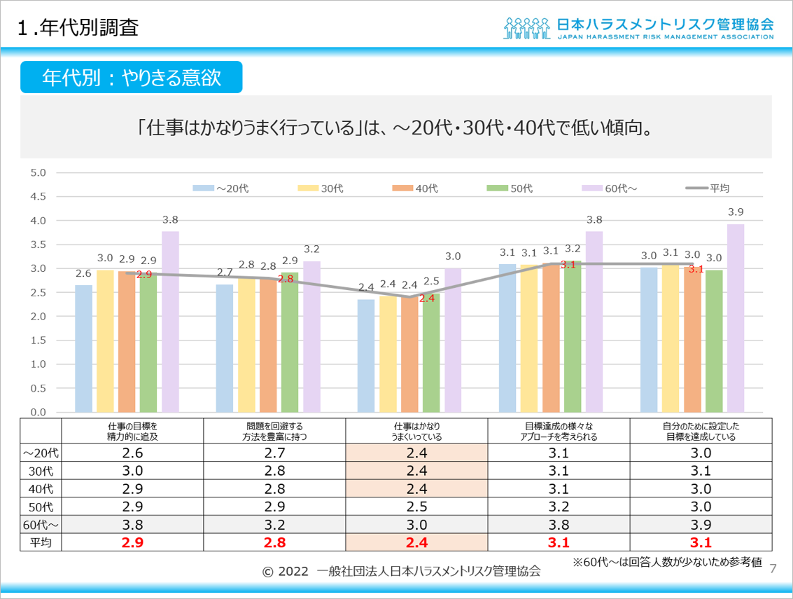 年代別の各設問単位においては、比較的若い世代で低い(ネガティブな)回答が目立った。設問内容は、具体的な業務に関するものよりも、「仕事がうまく行っている」など漠然とした項目で低さが目立つ。