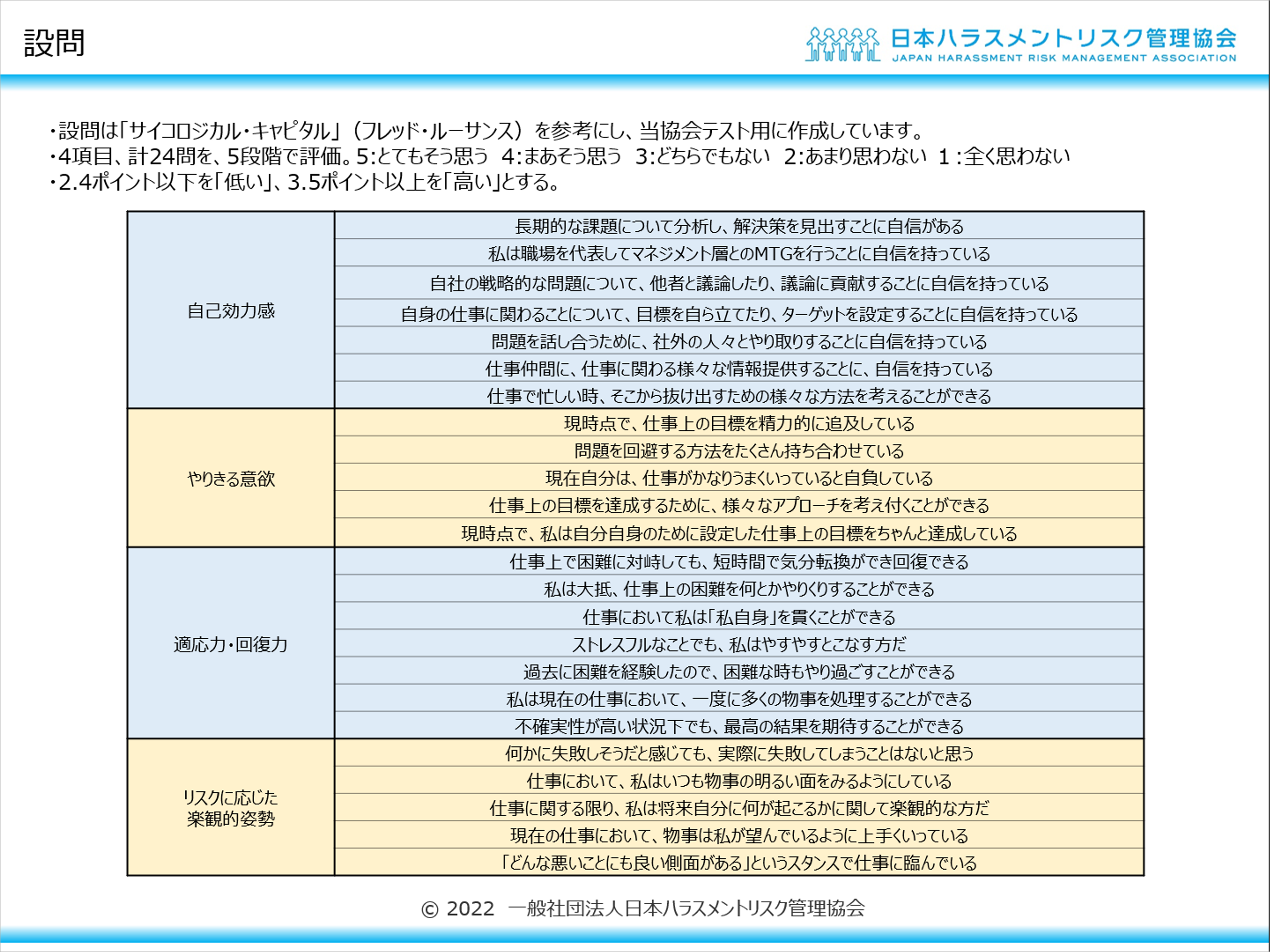 当テストは、米経営学者のフレッド・ルーサンス提唱「サイコロジカル・キャピタル」の4項目(Hope(希望)、Efficacy(自己効力感)、Resilience(レジリエンス)、Optimism(楽観性))を参考とし、WEBテスト用に設問を作成しています。
