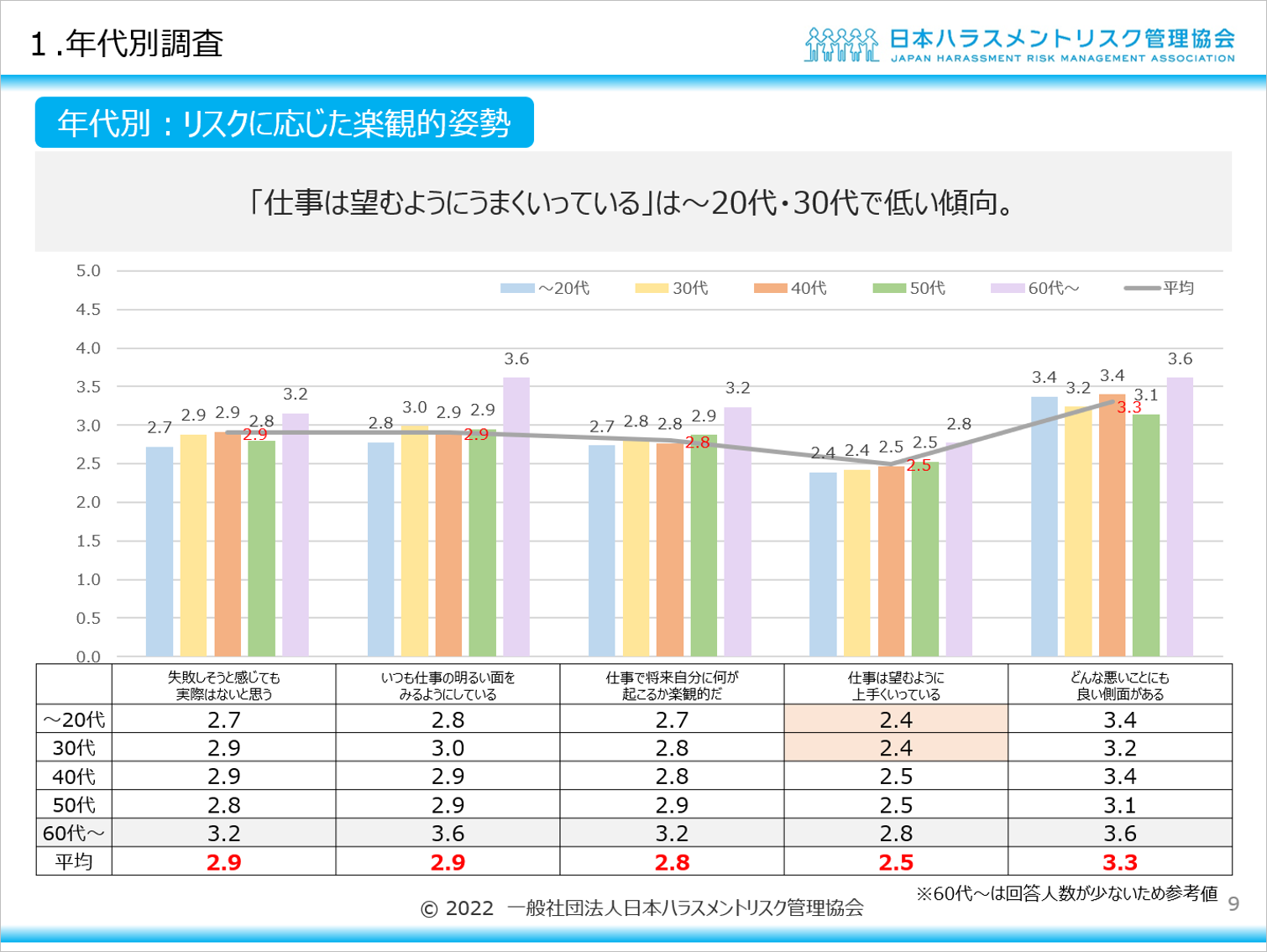 ・リスクに応じた楽観的姿勢では~20代・30代の若い世代で「仕事は望むようにうまくいっている」が低い傾向であった。
