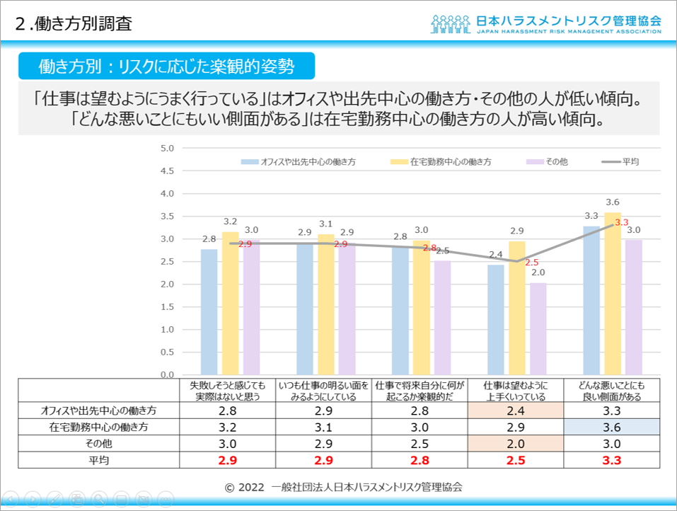 ・リスクに応じた楽観的姿勢では「仕事は望むようにうまく行っている」がオフィスや出先中心の働き方・その他の人が低い傾向。「どんな悪いことにもいい側面がある」が在宅勤務中心の働き方の人が高い傾向であった。