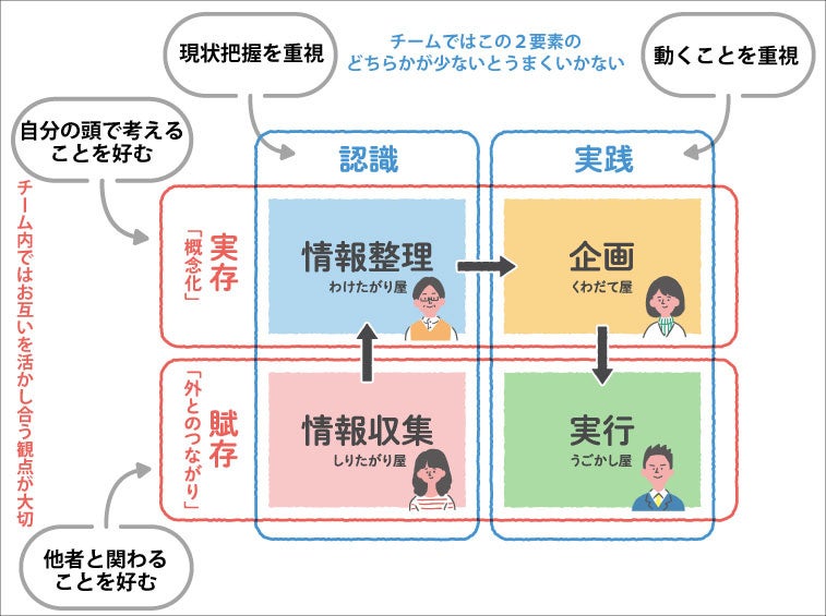 組織内で各々のタイプを把握し、互いを補完し合うためには、特性4象限(図1参照)などを用いたフレームワークを実施していきます。