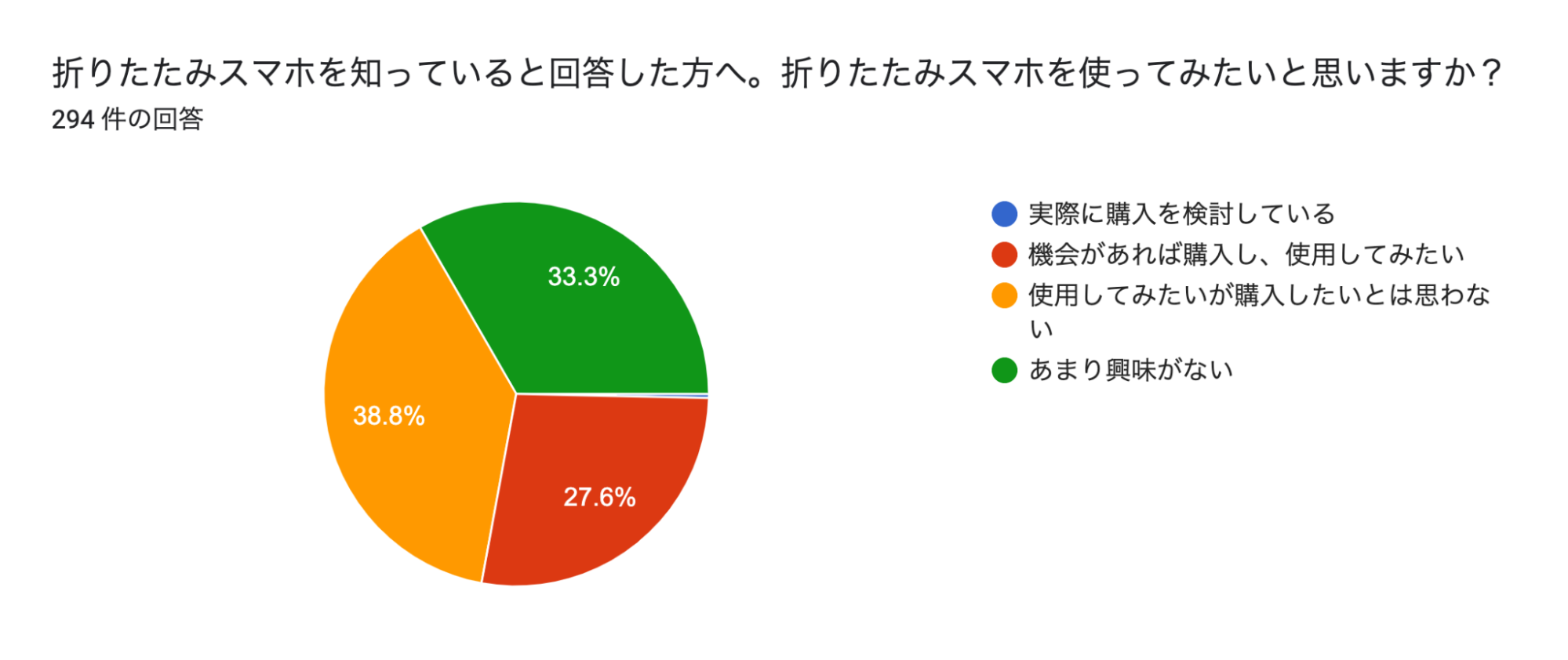 また、「折りたたみスマホを持っていない」人を対象に、「折りたたみスマホを使いたいか、購入したいか」と質問したところ、「購入を検討している」と答えた人は308名中僅か1名という結果になりました。