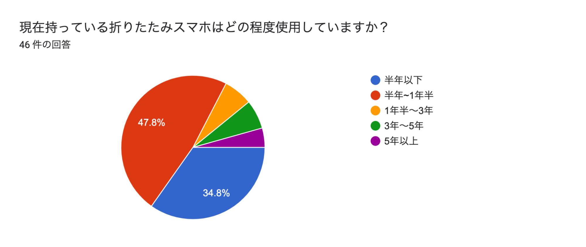 まず「折りたたみスマホをどれくらいの期間使っているか」という問いでは半年〜1年半以下の人が82%以上を占めていました。