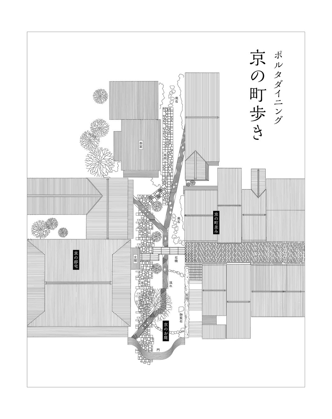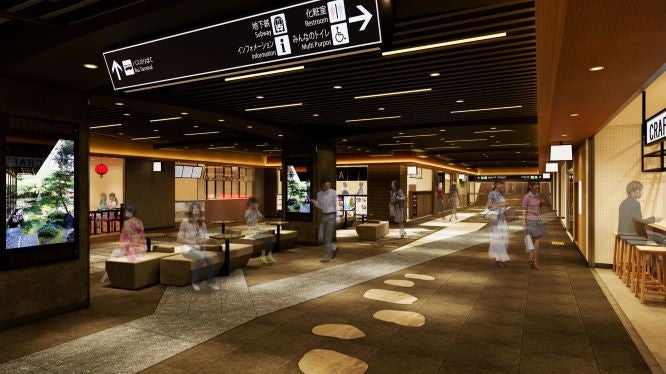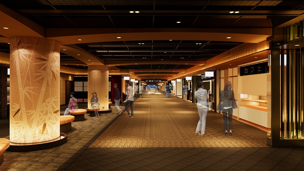 今回のリニューアルでは、ポルタ西エリア飲食店ゾーンを「京の町並み」、「京の邸宅」、「京のお庭」の3つのイメージで構成した造りとします。本年3月に先行オープンした西通りから東側の第1期改装区画は「京の町並み」をイメージし、軒が連なる京都の小さな路地を表現しましたが、今回の第2期改装区画のうち西通りから西側のゾーンについては「京の邸宅」をイメージし、お屋敷の室内空間を表現。欄間格子と聚楽のモチーフ、竹やもみじのある中庭の表現が京町家の風情を漂わせます。また西通りそのものは「京のお庭」をイメージし、嘉永元年(1848年)京都創業の植彌(うえや)加藤造園監修のもと、京都の町の縮景をテーマにした日本庭園を表現します。西通りには鴨川を表す天然石が敷かれ、その付近にはテイクアウトした商品を召し上がっていただくことができるベンチも配置する予定です。