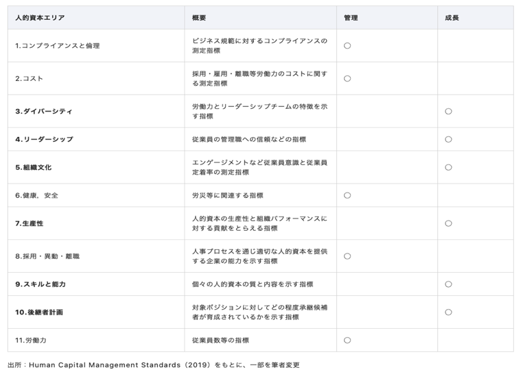 2022年、企業が取り組むべき課題は二つあります。一つは、「人的資本の最大化」。これまでの「人的資源管理(Human Resource Management)」から「人的資本管理(Human Capital Management))」へと人事施策を戦略的に転換していくことが求められています。わかりやすい言葉で述べるなら、社員一人ひとりの労働ポテンシャルを最大限に発揮させる人事施策、キャリア開発支援に戦略的かつ計画的に取り組みながら、企業の生産性と競争力を再活性化させることです。もう一つは、「人的資本の情報開示」です。2018年12月に国際標準化機構(ISO)が発表した、ISO30414(人的資本に関する情報開示のガイドライン)に対応することが求められていきます。ISO30414は、11項目から構成されています。(11項目の詳細は、下記の図を参照)