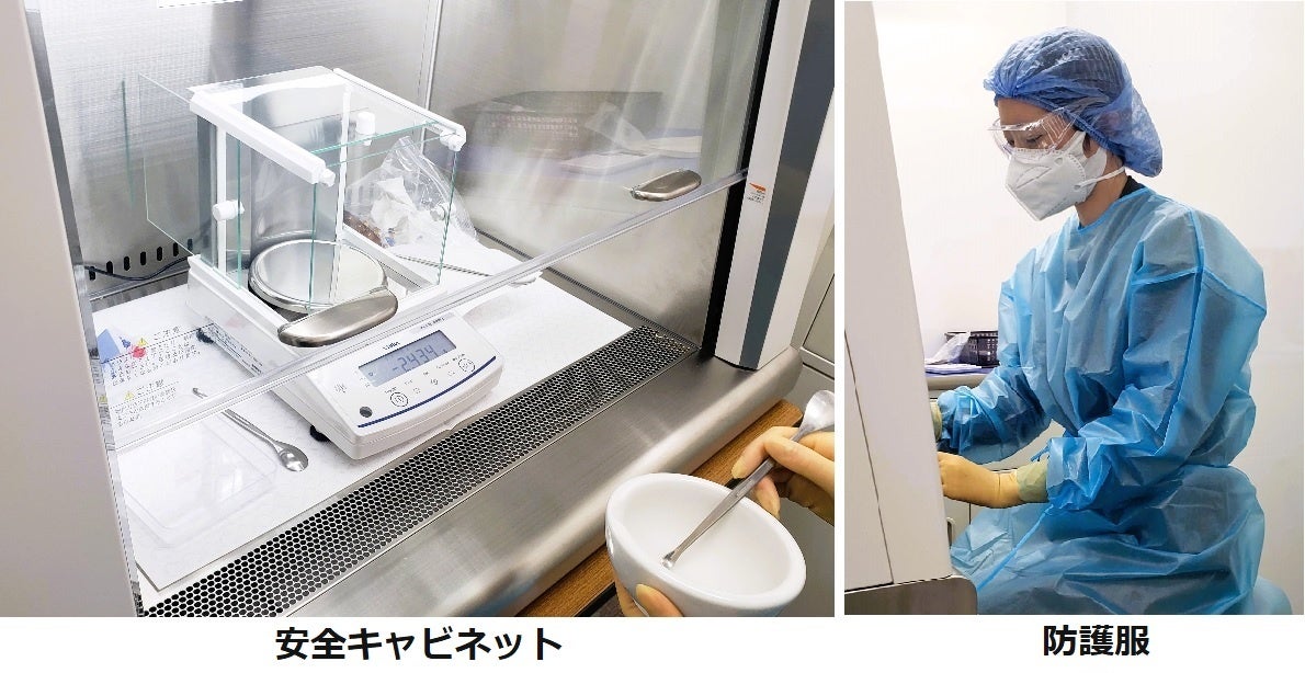 写真左から 安全キャビネット、防護服