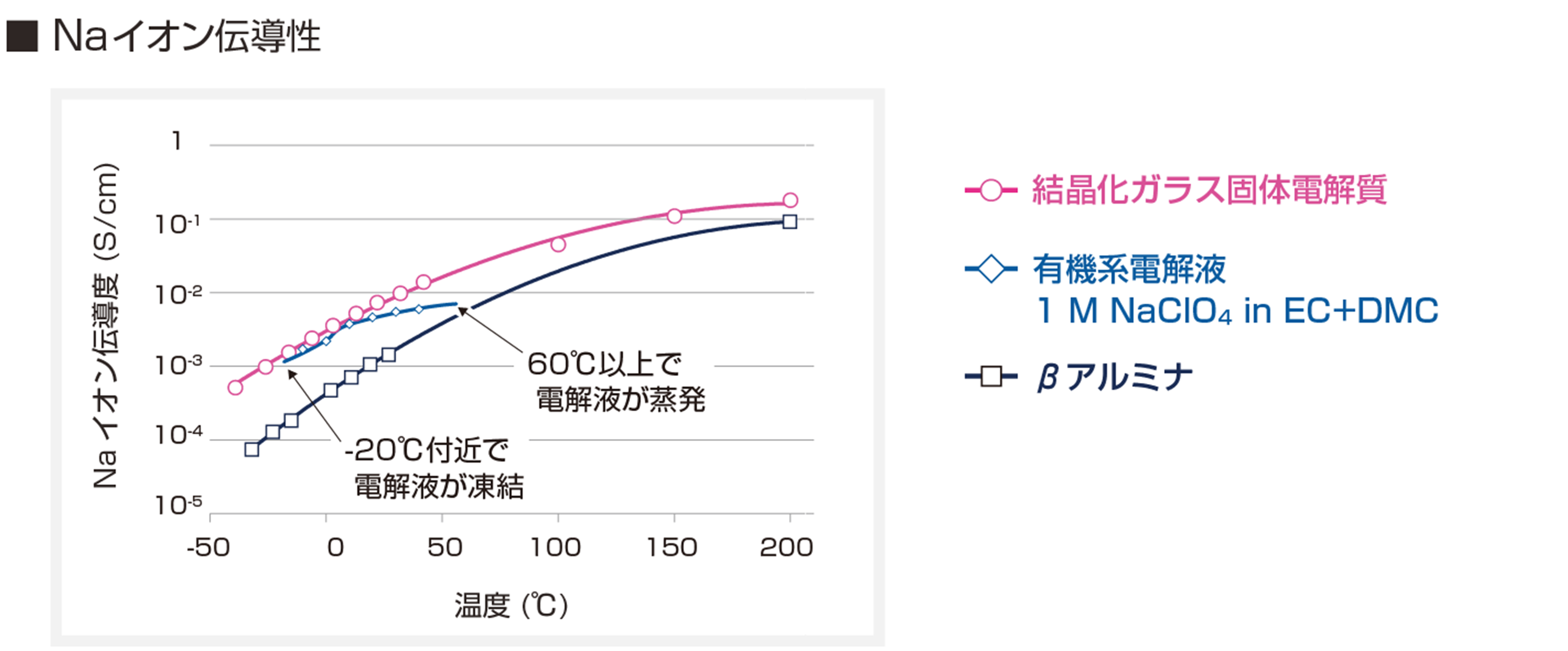 日本電気硝子株式会社は、有機系電解液を超えるナトリウムイオン伝導性を持つ固体電解質(結晶化ガラス製)を開発し、電池の主要部材のすべてに結晶化ガラスを用いた全固体ナトリウムイオン二次電池を世界で初めて実現しました。