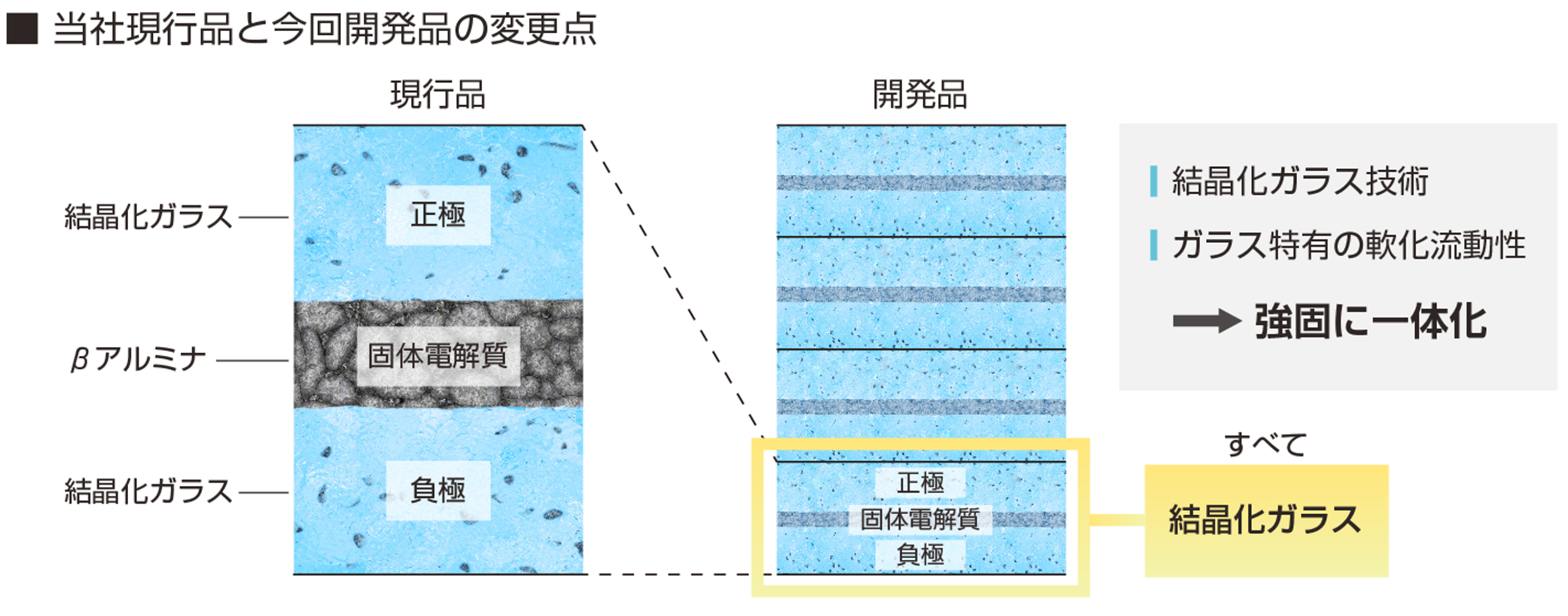 主要部材(正極、負極、固体電解質)をすべて結晶化ガラスに統一することで、当社の独自技術であるガラスの軟化流動を用いた強固な一体化を実現し、非常に良好なイオン伝導パスをもつ蓄電素子※を形成しました。また、1つの電池内に蓄電素子を容易に集積することができ、電池設計の自由度向上にも寄与します。