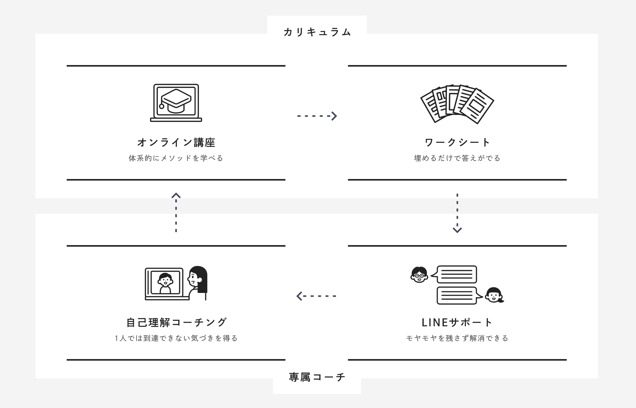 自己理解プログラムとは「やりたいこと探しを終わらせる」をコンセプトとした、3ヶ月10STEPのコーチングプログラムです。自己理解メソッドに基づいたワークとコーチングセッションに加え、LINEでのサポートも充実しているので、3ヶ月間で「やりたいこと探しを終わらせる」ことができます。