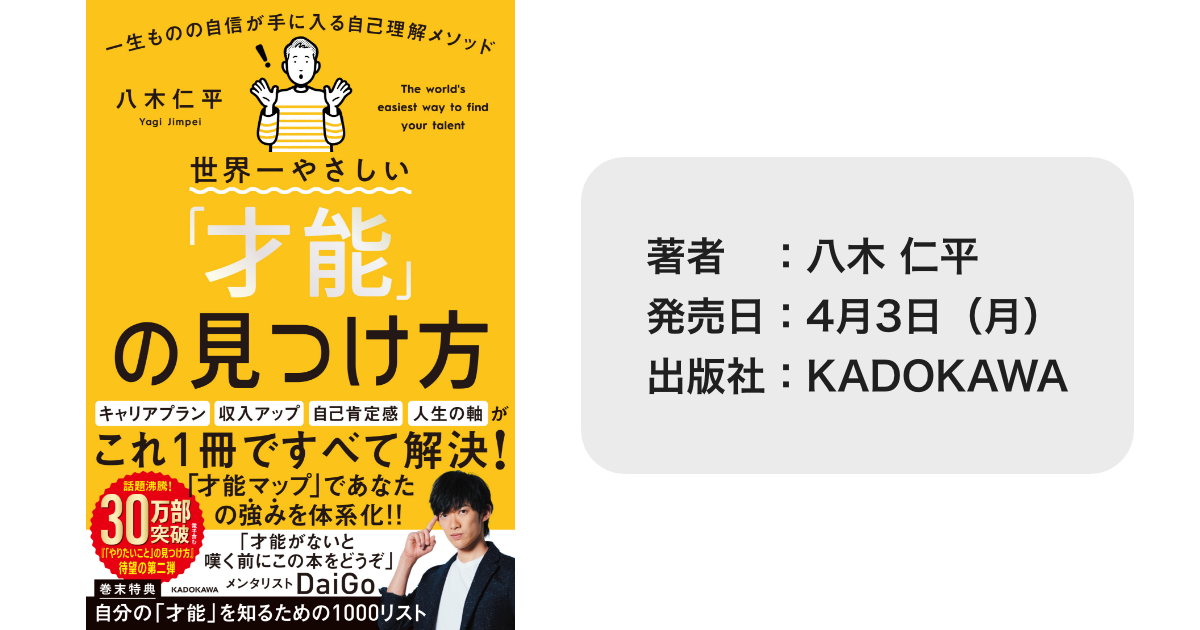 今回は、さらに多くの方に自己理解メソッドを届けるべく、八木の2冊目となる書籍『世界一やさしい「才能」の見つけ方』を4月3日(月)からお届けします。その出版を記念し、才能フェスとしてクラウドファンディングを実施し、たくさんのリターンをご用意しました。