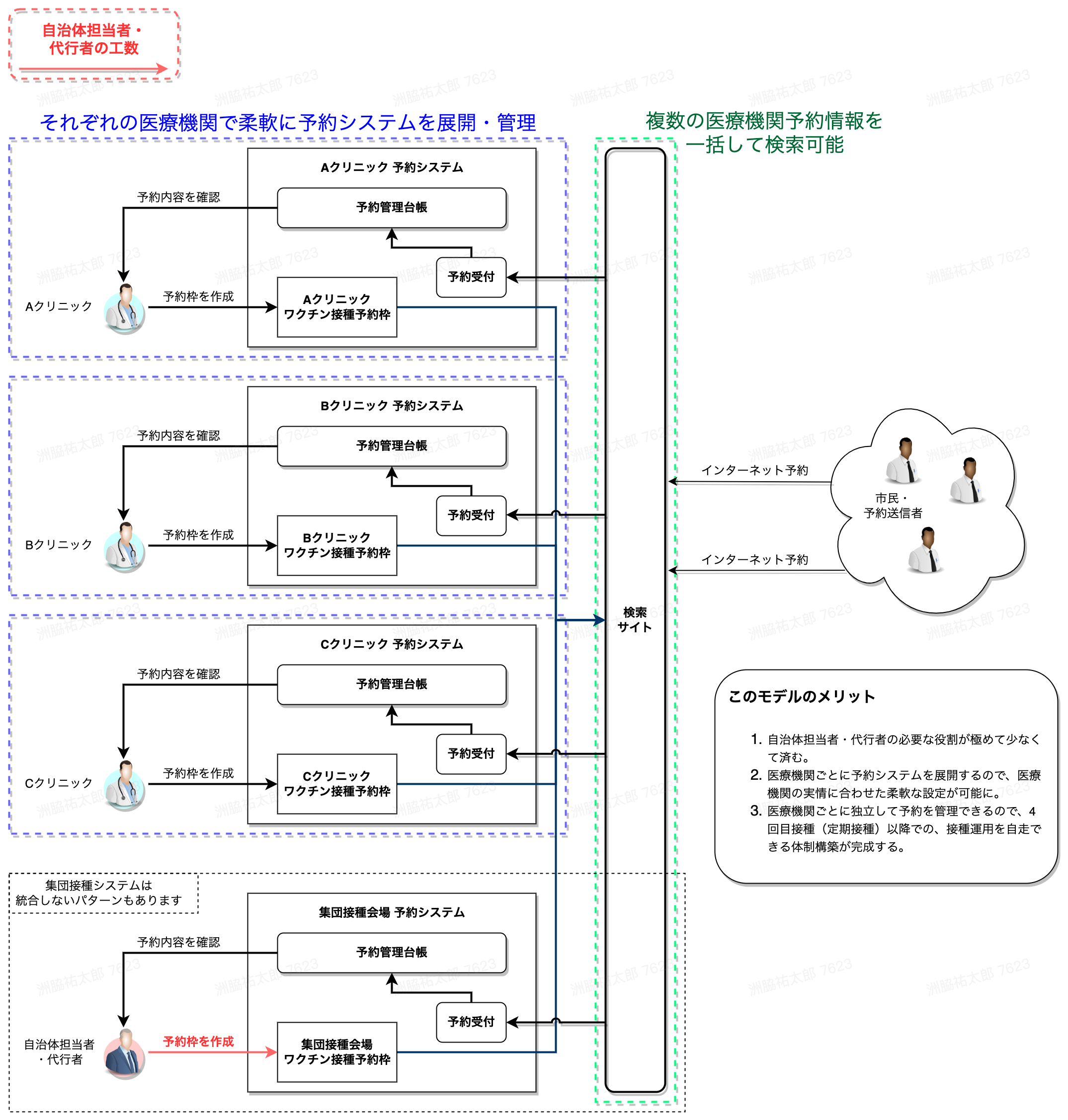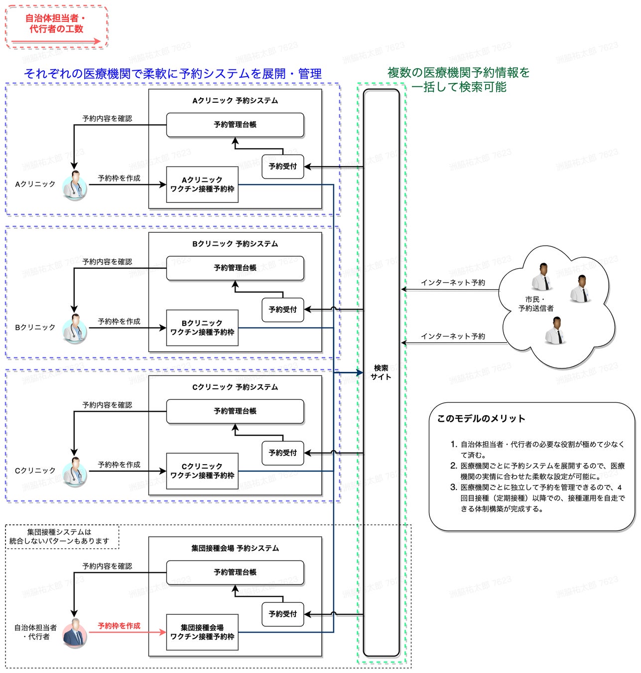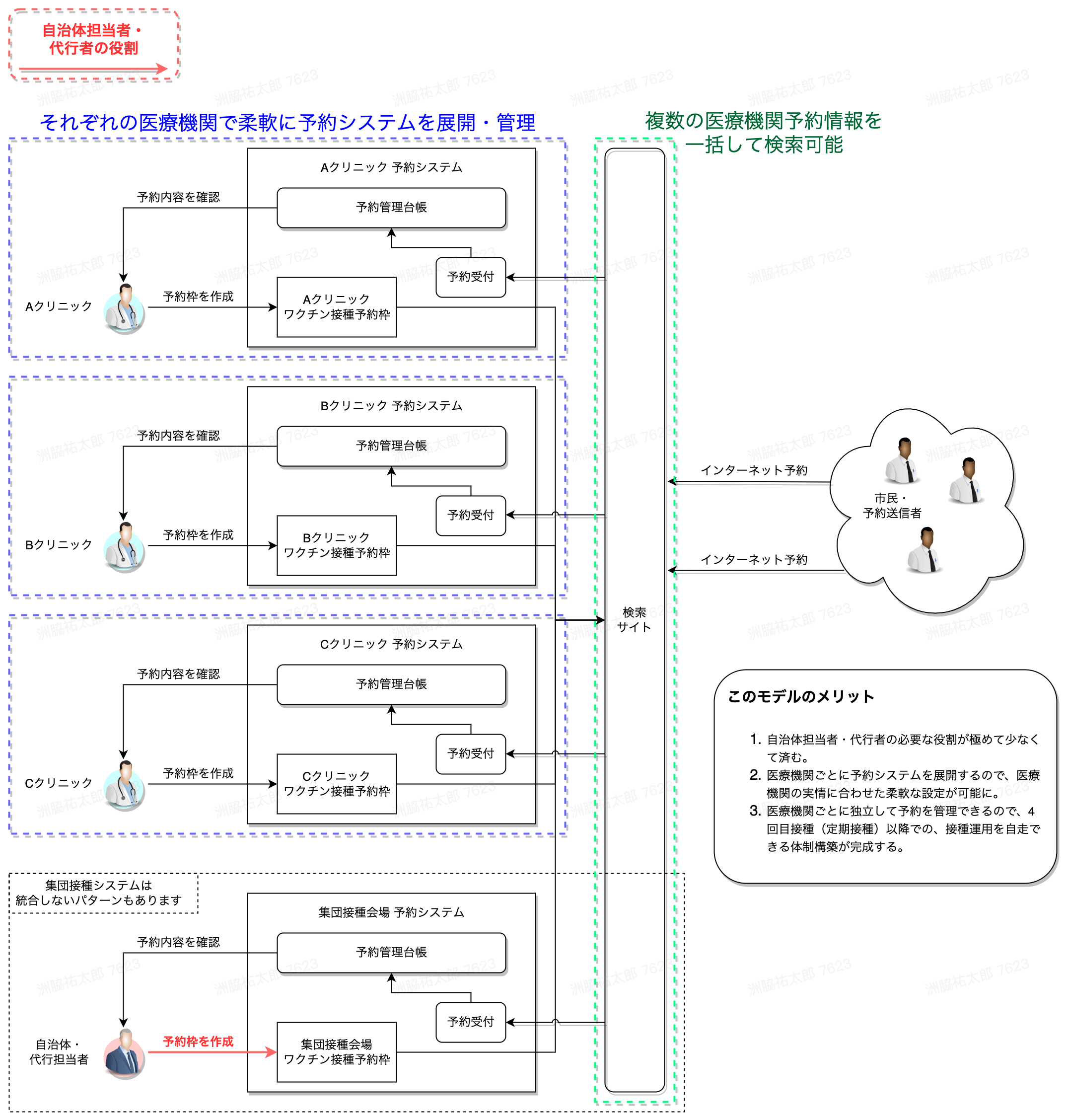 「Nest 接種モデル」では医療機関が個々でLINE予約システムを展開・管理し、この複数の予約システムを検索することができる特設の検索サイト(Botlogy開発)を公開します。そうすることで、市民は特設の検索サイトから空き枠の検索を行い、希望する医療機関のLINEから直接ワクチン接種を予約することができます。