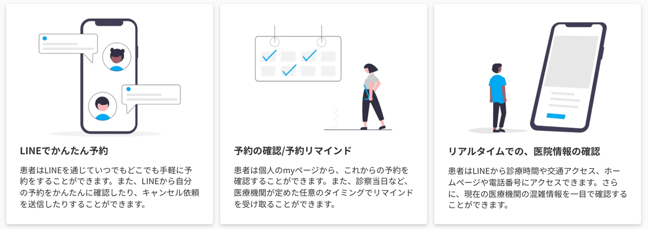 「Nest Reserve」は、市民がLINEを用いて予約を行い、さらに診療相談や医療機関の情報閲覧まで行うことができる予約システムです。「Nest Reserve」において、各医療機関はコロナワクチンに最適化された予約枠を設定し、市民はLINE上で予約枠にアクセスするのみでなく、リアルタイムでの医院情報の確認、チャットボットの利用などを行うことができます。