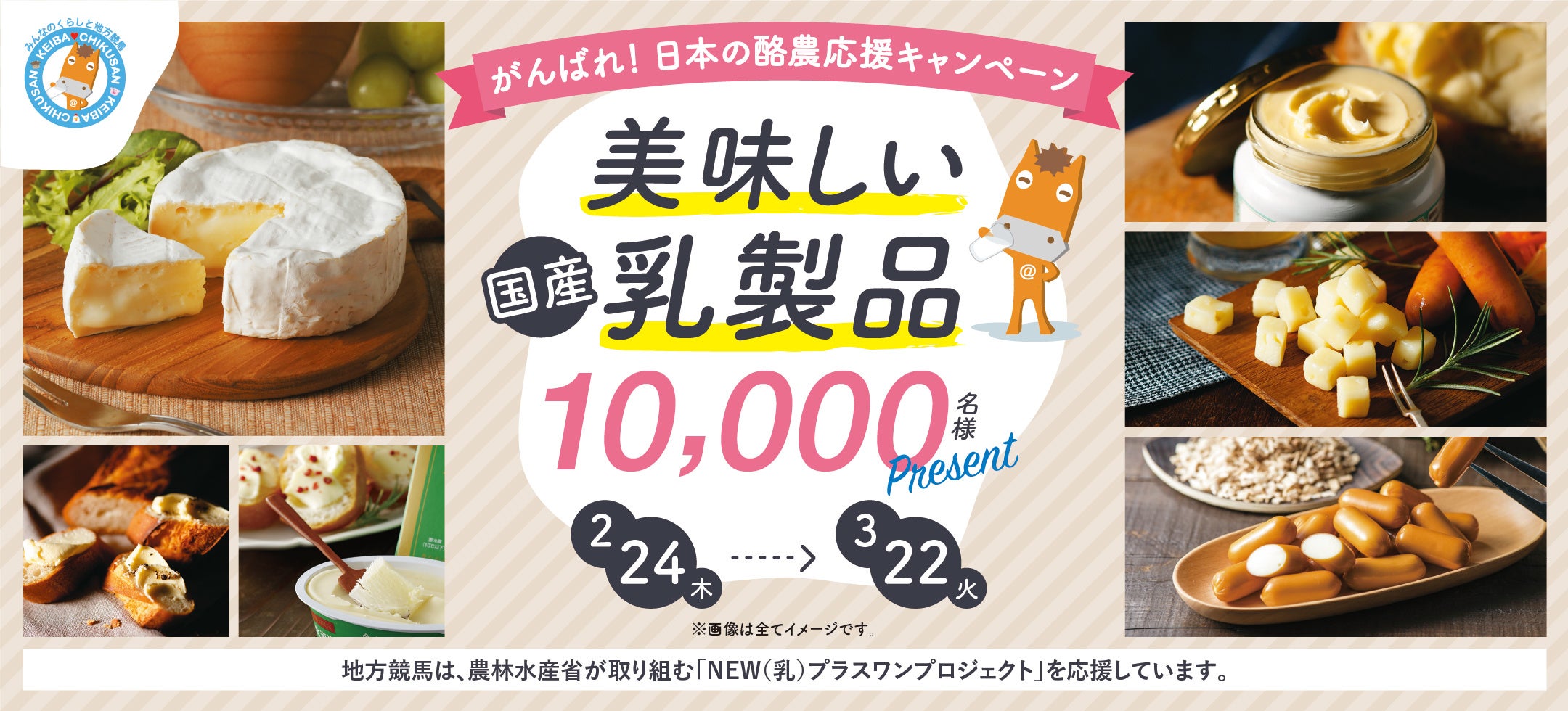 本キャンペーンは、農林水産省が取り組む「NEW(乳)プラスワンプロジェクト」と連動し、多くの皆様に牛乳や国産乳製品の消費を促し、全国の酪農家の皆さんを応援するとともに、地方競馬による畜産振興や社会貢献について周知を図ることを目的としたものです。