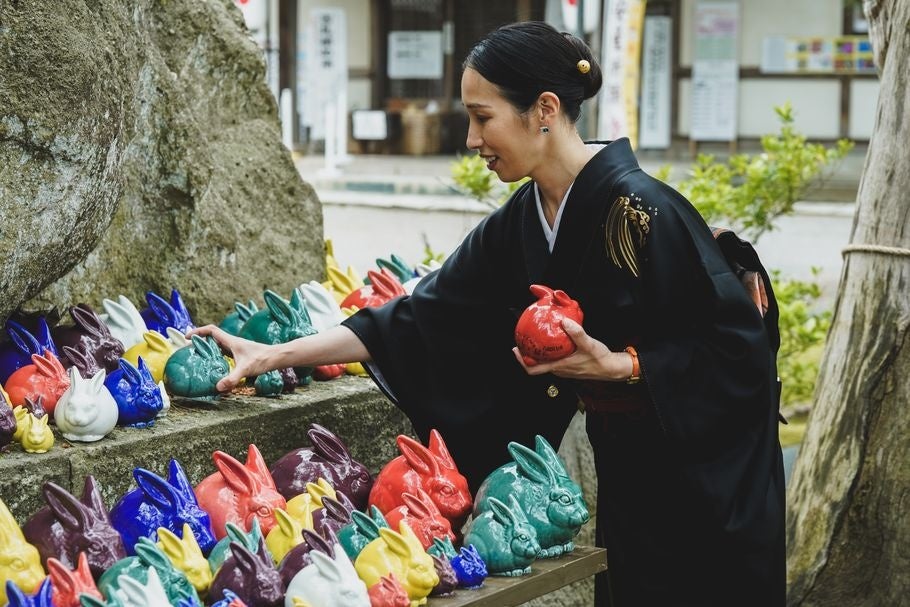 写真は料亭「梶助」の女将。女将が小松市をアテンドしてくれるプランも。実は5月にモニターツアーとして初の試みである「女将と歩く小松市ツアー」に参加しました。兎と猿を祭る、2つの神社を詣でる「うさる詣」を一緒にしたときの写真です。