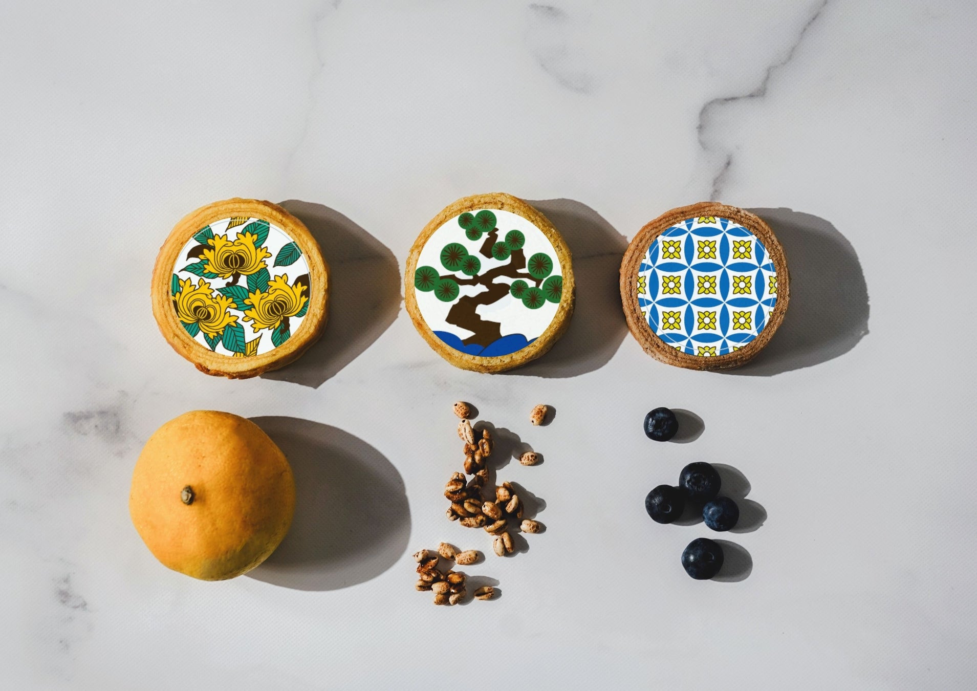 能登、金沢、小松、それぞれのバウムクーヘンに異なる柄を。この模様は、小松市に住むアーティストである「九谷もんよう」さんによるもの。九谷もんようさんによるイラストレーションが小松の伝統と混ざり合い、素敵なデザインに。バウムクーヘンの上にのせられたチョコレートは、そのままバウムクーヘンと一緒に食べても、少しレンジで温めてフォンダンショコラのように楽しんでもOK。チョコレートと各素材の相性も抜群です。