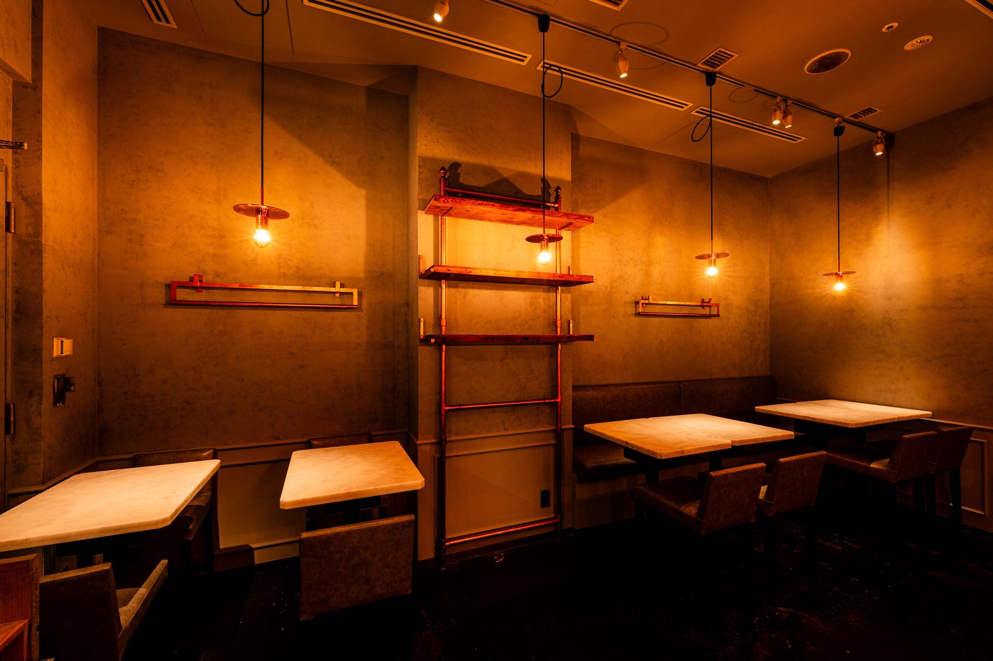 大理石のテーブルをメインに、グレー、ブロンズでシックに仕上げた店舗デザイン。