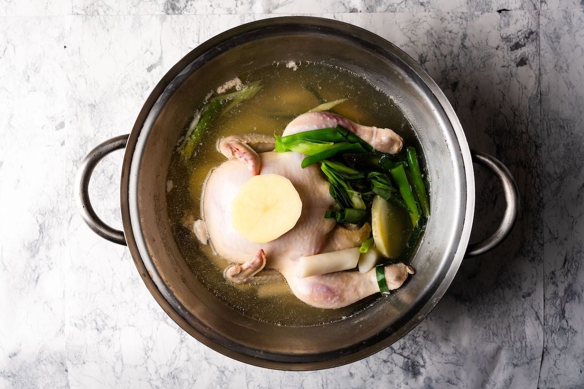 鶏ぶつ、トッポギ、じゃがいも、長ネギ、にんにく、ニラ、えのき、白キムチ