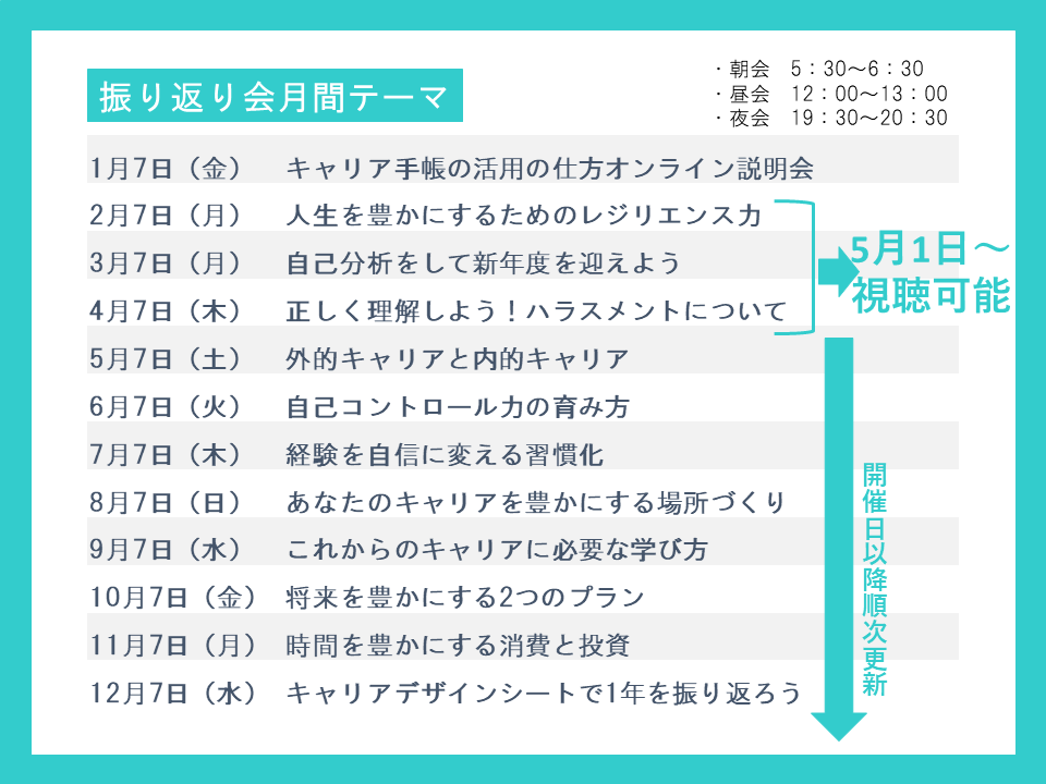 キャリア手帳内にある各キャリアテーマについておこなっているオンライン会。手帳を見て理解するだけではなく、動画を見てより深く理解を深めていきます。