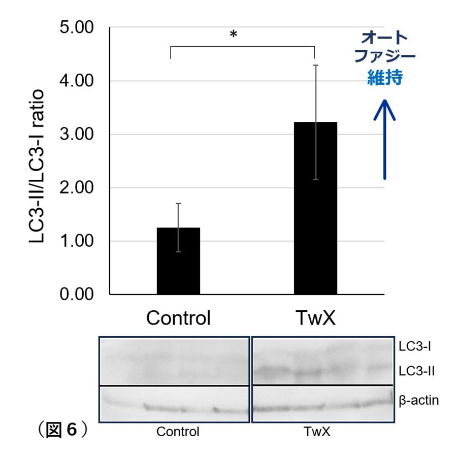 LC3微小管関連タンパク質は、オートファジー経路において不可欠な役割を果たすタンパク質です。ADの危険因子である糖尿病の脳では、LC3タンパク質が完全に消失し、オートファジーがほとんど機能していないことがわかりました。TwXを投与した同年齢の糖尿病マウスでは、LC3タンパク質の発現が見られました。TwXは糖尿病でもオートファジー機能を維持できることが示されました(図6)。