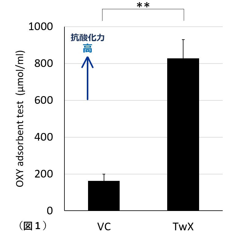 TwXは8種類の有用成分をバランスよく配合されていることによりVitamin C溶液(VC)のような単一成分の抗酸化物よりも抗酸化力が5倍以上も強いことがわかりました(図1) 。細胞内においても、酸化剤による細胞やミトコンドリア内のROSの上昇を有意に抑え、抗酸化酵素を有意に上昇させることが明らかになっています。