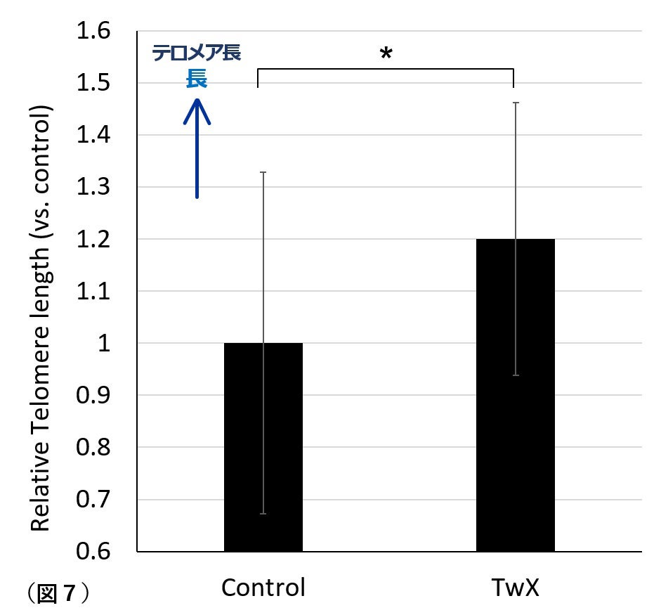 テロメアの長さは、年齢の生物学的指標と考えられています。老化の過程で細胞が分裂するにつれて短くなります。最近では、テロメア短縮は老化関連疾患やAD発症の潜在的な要因であると報告されています。ヒトでは認知症によりテロメアが短縮する傾向があると指摘されています。テロメア短縮はADで酸化ストレス、炎症のメカニズムを介して認知機能を低下させます。ADの危険因子である糖尿病マウスにおいて、TwX投与群は同週齢の非投与群と比較して有意に長くなることが明らかになりました(図7)。老化を予防して、AD進行を抑制しているエビデンスのひとつと思われます。