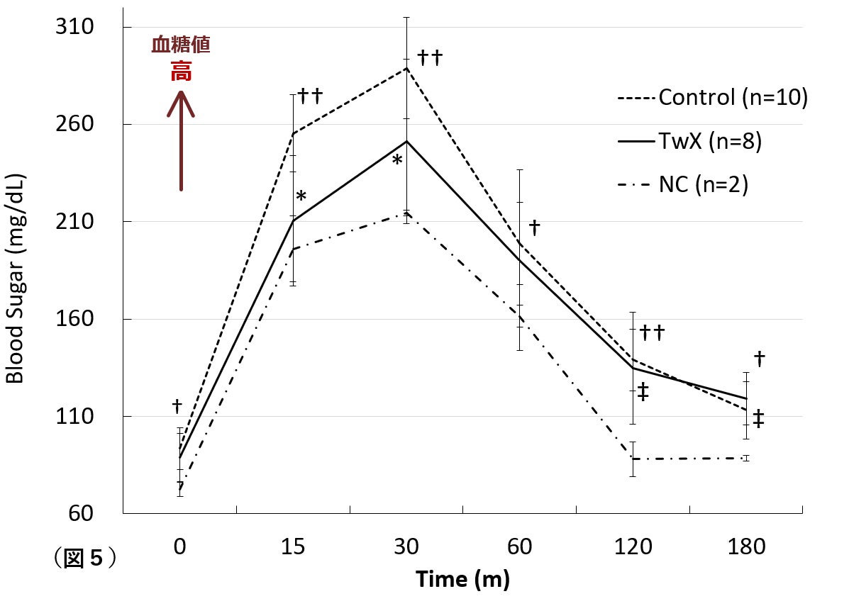 糖尿病はADや血管性認知症、その他のあらゆる種類の認知症のリスクを高めることが明らかになっています。糖尿病ではROSの増加やミトコンドリア機能障害、炎症などADと共通した神経変性メカニズムが確認されています。そのため、ADを予防するためには高血糖状態を改善させる必要があります。TwXは高血糖状態の持続によるROSの上昇を抑え、高血糖を改善することが明らかになりました(図5)。この結果、TwXは高血糖状態による血管内皮のダメージを抑制し、認知機能低下を予防する可能性が示唆されました。