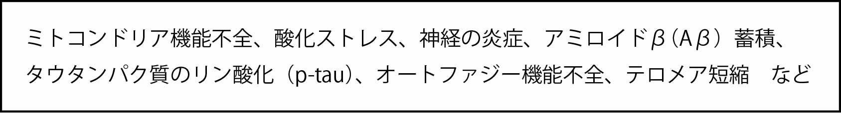 ミトコンドリアは、エネルギー(ATP) の大部分を担う細胞内小器官です。神経細胞のエネルギー伝達経路のほとんどはミトコンドリアで行われますが、加齢によってミトコンドリアの機能が低下します。これは脳の老化の特徴であり、ADなどの神経変性疾患では特に顕著です。ミトコンドリアの機能不全は酸化ストレスを増加させます。エネルギー生産の低下と慢性的な高い酸化ストレスは、脳の老化やアルツハイマー病に伴う認知機能の低下の原因です。