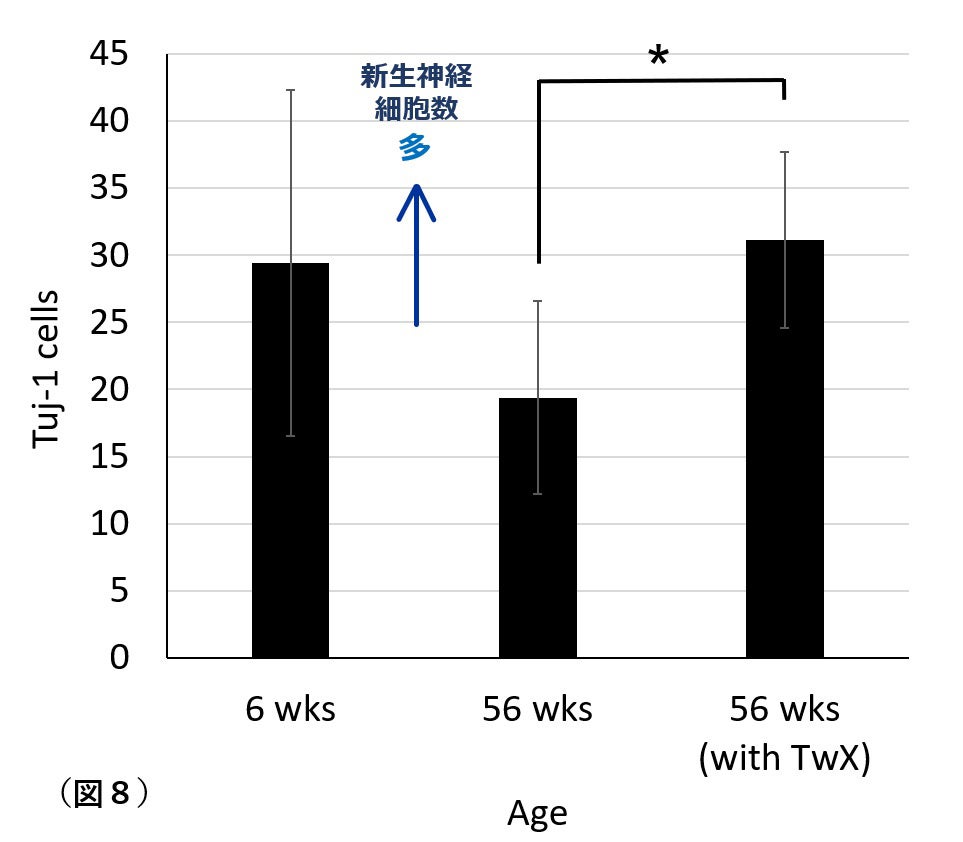 本論文でも高齢マウス脳において神経新生細胞数が減少することを確認しました(図8 , 56wks)。TwXを投与した同年齢の老齢マウス海馬の神経新生細胞は、若年マウス(6wks)よりもやや多いことが示されました。