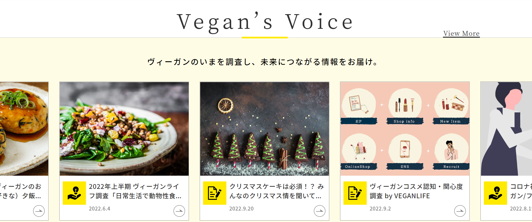 ヴィーガンを始める理由は様々あります。こちらのサイトでは、ヴィーガン初心者の方やプラントベースの方向けのコンテンツを中心に「基礎知識」「旬なニュース」「気軽に取り入れられる豆知識」「身近なヴィーガン情報」などをお届けします。ライフスタイル、食、人、地域にフォーカスし、インタビュー形式でお届けするコンテンツや都道府県別のヴィーガンレストラン(オプションも含む)・カフェ情報も掲載しています。