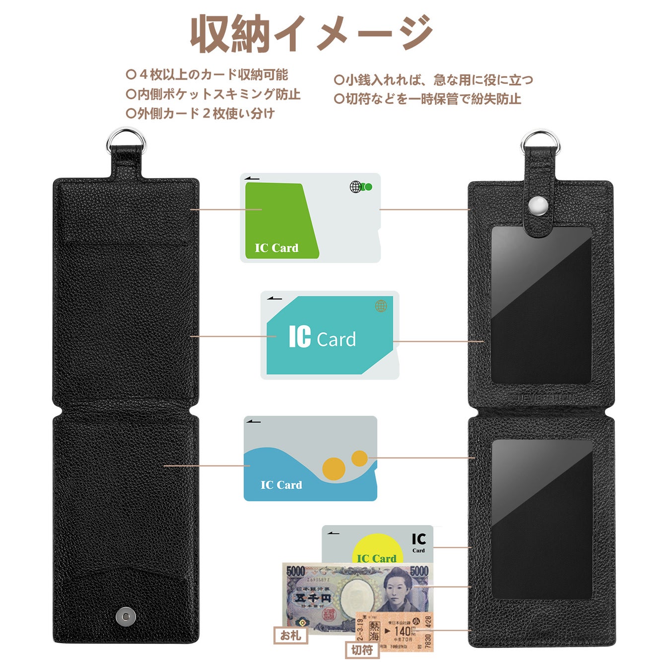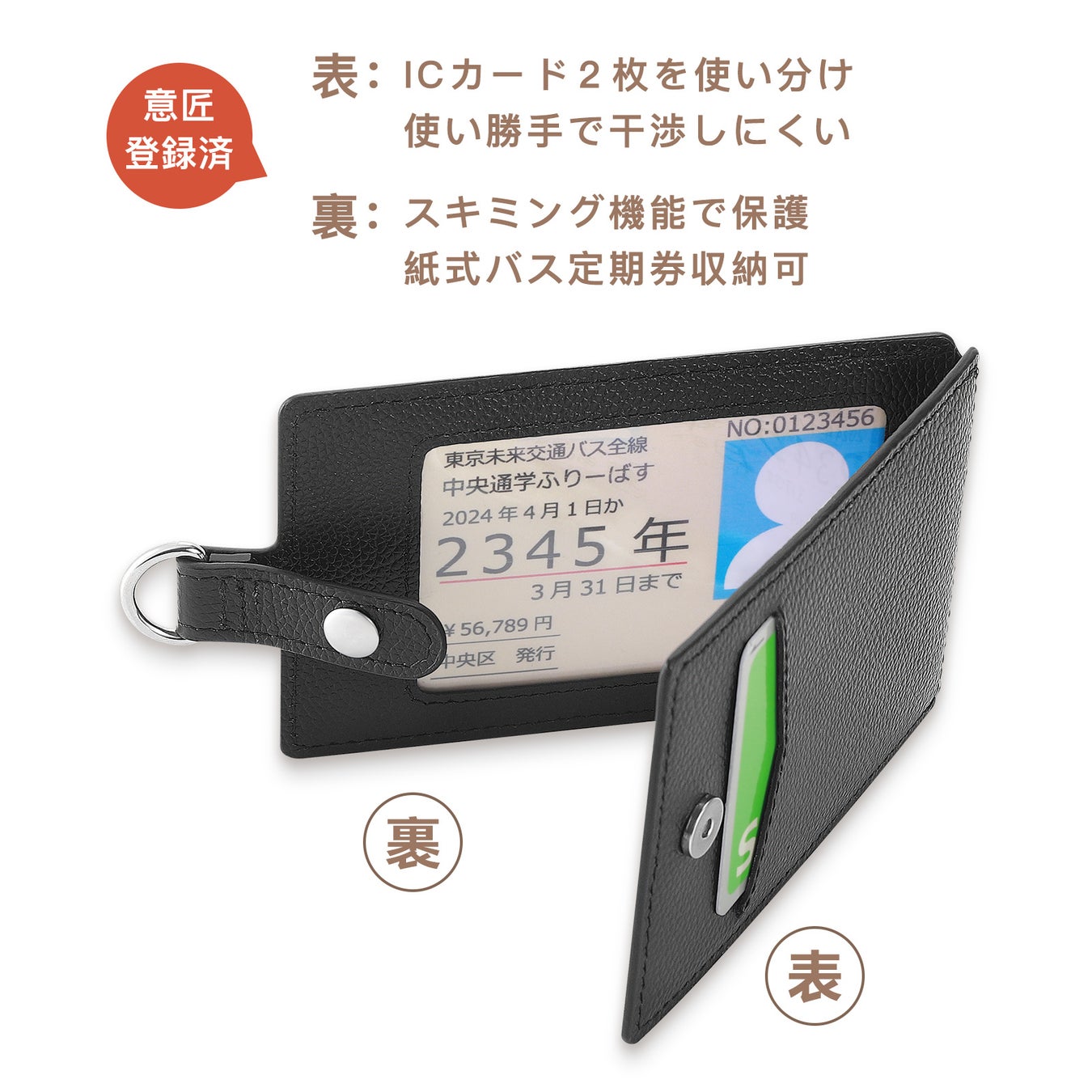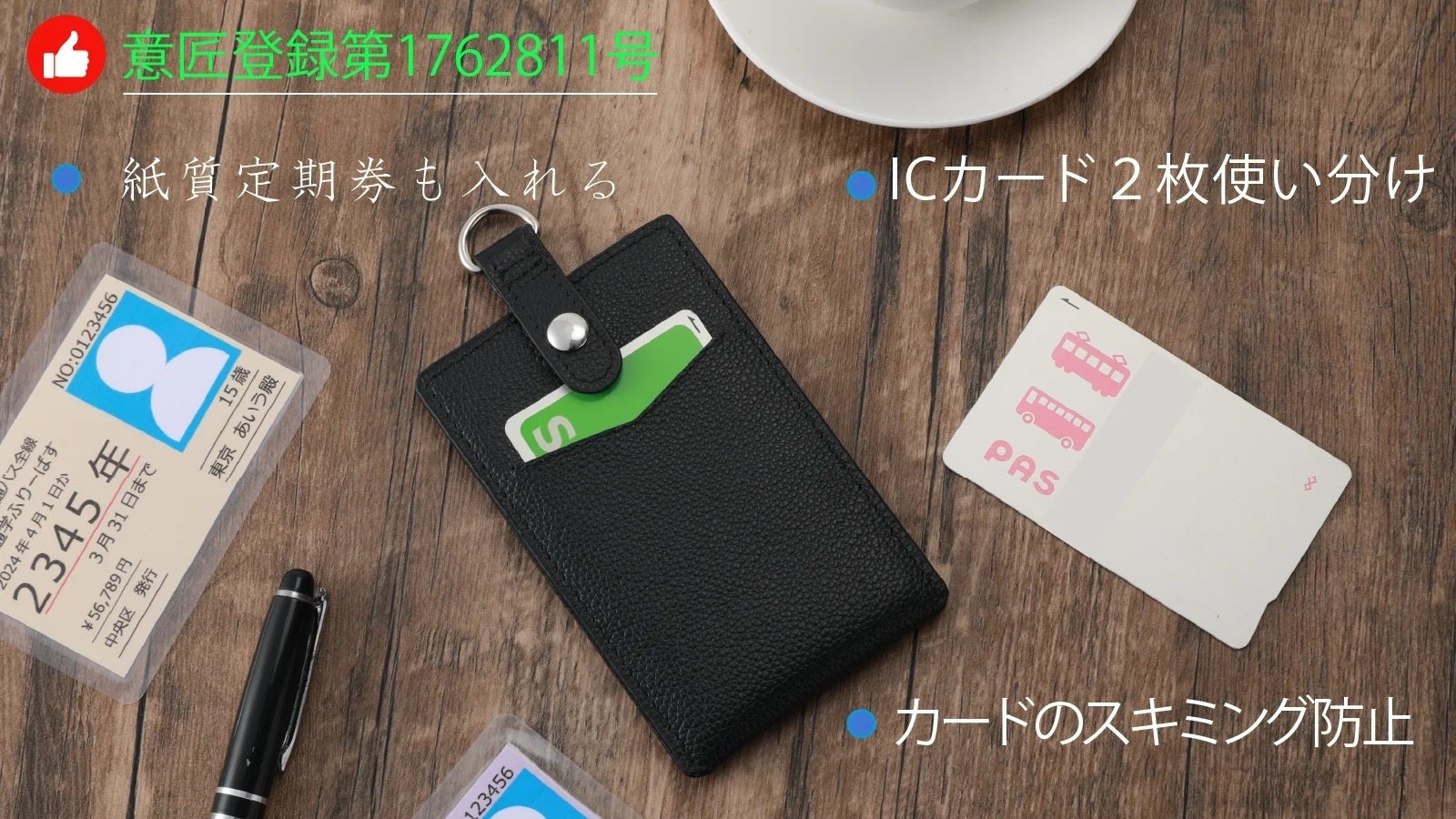 意匠権登録済!交通系ICカード2枚が干渉なく使い分け、複数カードをお持ちの場合には便利性が高いです!スキミング防止、大切なカード情報を守り、やや大きめの写真付き定期券も格納できます!薄型、牛本革!