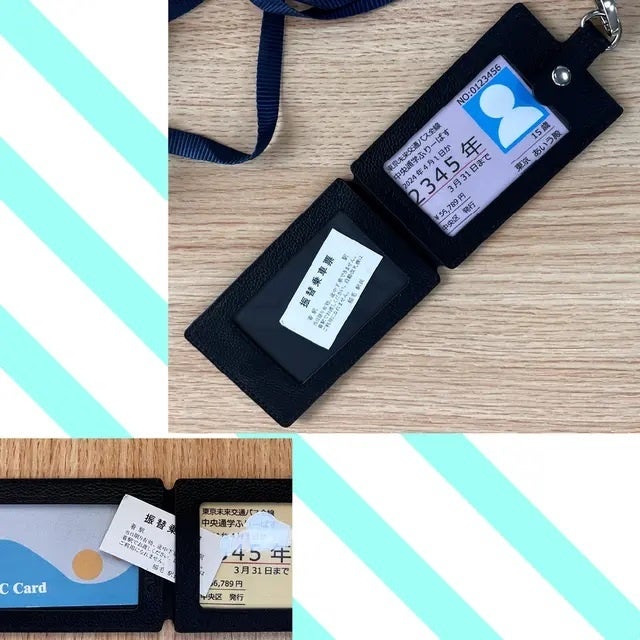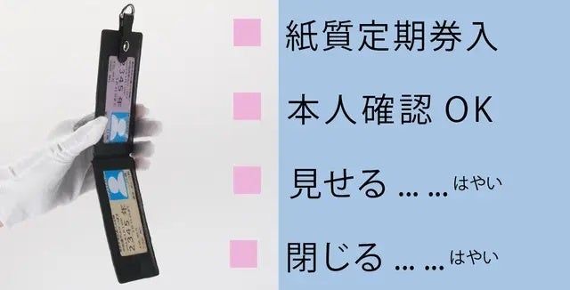多くの地域で写真付きの紙質定期券を利用しているところですが、通常のパスケースはICカードのサイズで、紙質定期券が入らないです。「すいすいパスケース」の外側ポケットは通常サイズで、内側ポケットは大きめのサイズにしましたので、通常の交通系ICカードだけではなく、紙質の定期券も格納できます。それに、内側ポケットに透明PVC窓を設けています。パスケースを開くことだけで本人確認ができ、定期券を取り出す手間を省けます。