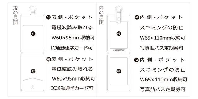 「すいすいパスケース」は、外側ポケット2つがあり、使い分けができます。内側ポケットも2つがあり、スキミング防止ができます。