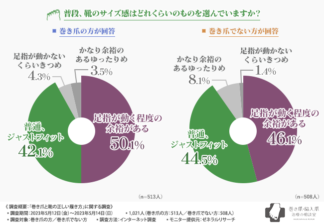 ・靴のサイズ感は、巻き爪の方は『足指が動く程度の余裕がある』、巻き爪でない方『全体的なゆとり』と回答