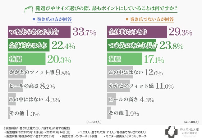 巻き爪の方がつま先のあたり具合を気にして靴を選んでいるのに対し、巻き爪でない方は全体的なゆとりを意識している方が多いことがわかりました。