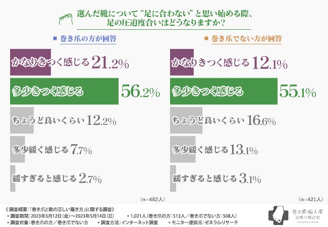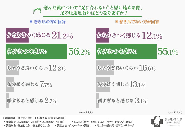 巻き爪の方のおよそ8割、巻き爪ではない方のおよそ7割が、靴がきつくなってきた際に足に合わないと感じていることが明らかになりました。