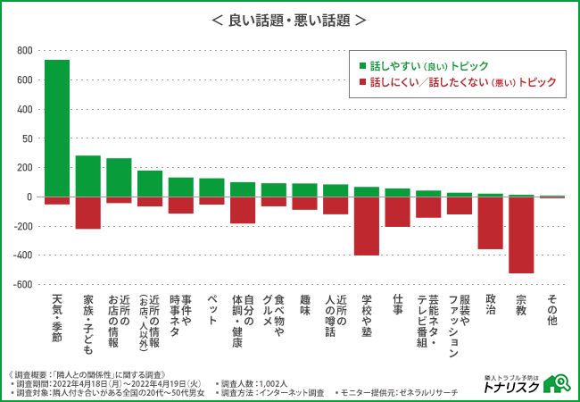 ・挨拶の話題として無難なのは「天気・季節」「近所の情報(お店・人以外)」「ペット」。逆に避けるべきは「宗教」「政治」「人の噂話」